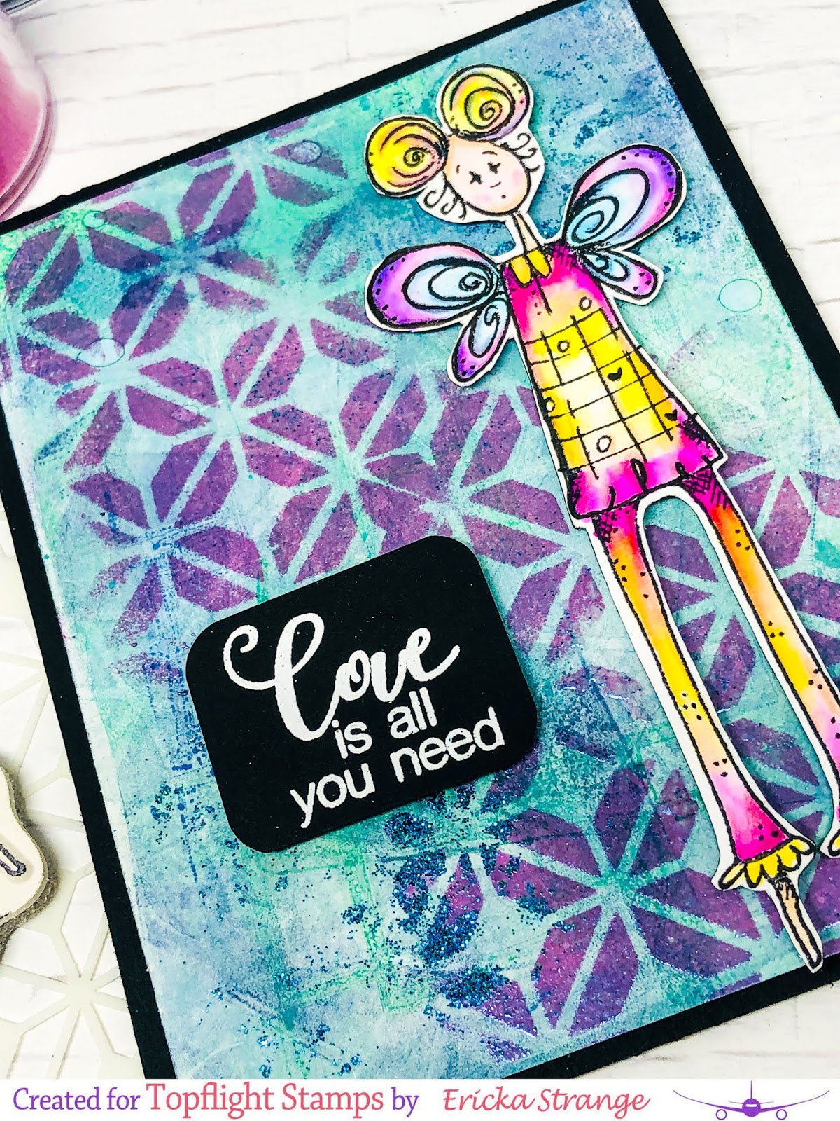 I also used a foam blending tool and embossing ink to add the Carabelle stencil pattern to the background of gel press paper I had made previously. I then heat embossed the two patterns with Emerald Creek Kiss of the Fairy (for shine) and Mermaid Fin (for sparkle) Embossing powder to get a fun background.This stencil is great because it has two patterns that you can play around with.