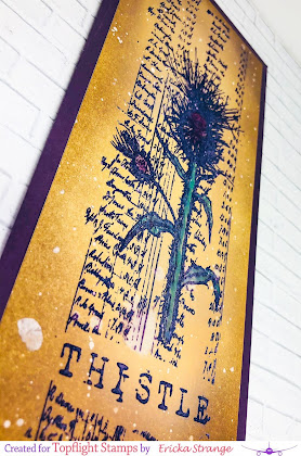 Hello friends! Ericka from Strangely Creative here and today I'm playing with the AALL & Create Thistle stamp from Tracy Evans. I love this beautiful stamp and I'm always partial to images with script in the background. I love this set so much that I created a slimline card along with a bookmark.